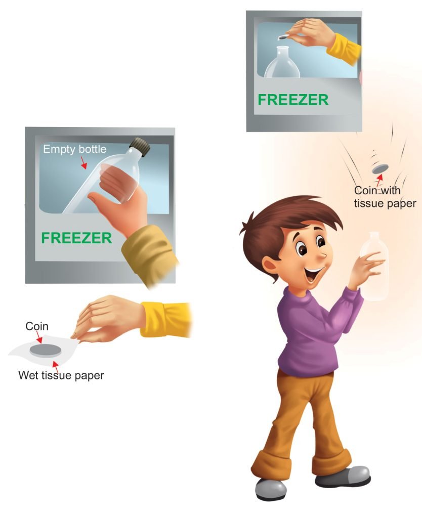 The coin will launch into the air with great speed. When we cool the bottle inside the freezer, the air inside it contracts, making the outside air push towards the bottle. As a result, when we leave the bottle open inside the freezer, more air fills inside it. Finally by placing the wet tissue-coin over the mouth, we seal off the bottle, leaving no place for the contracted air to escape. But when we hold the bottle, the air inside begins to heat up and expand. It keeps expanding until pressure is exerted onto the coin, breaking the ice formed at the mouth, and launching it into the air.
