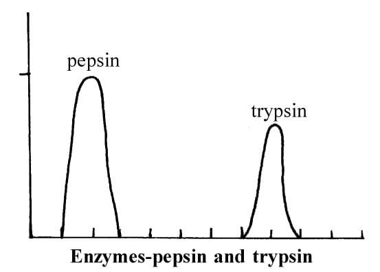 2. The pH effect : There is optimum value of pH for every enzyme at which the most rapid activity occurs. Extreme acidity or alkanity usually causes irreversible destruction of the enzyme. Pepsin which acts in the acid medium of gastric juice, has an optimum pH of 2-0.