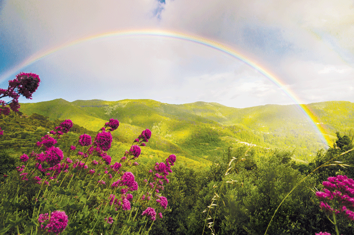 Rainbows are a collection of rays that are reflected back from glinting raindrops that are suspended in the atmosphere after a rainstorm. The droplets act as tiny prisms that reflect the light at an angle of approximately 42 degrees. They have a different density than the air that surrounds them. So with each droplet acting as a tiny prism, the light gets broken up into its component wavelengths. Thereafter, it is reflected back at us. This process creates the arc with the band of colours of the spectrum or the rainbow.