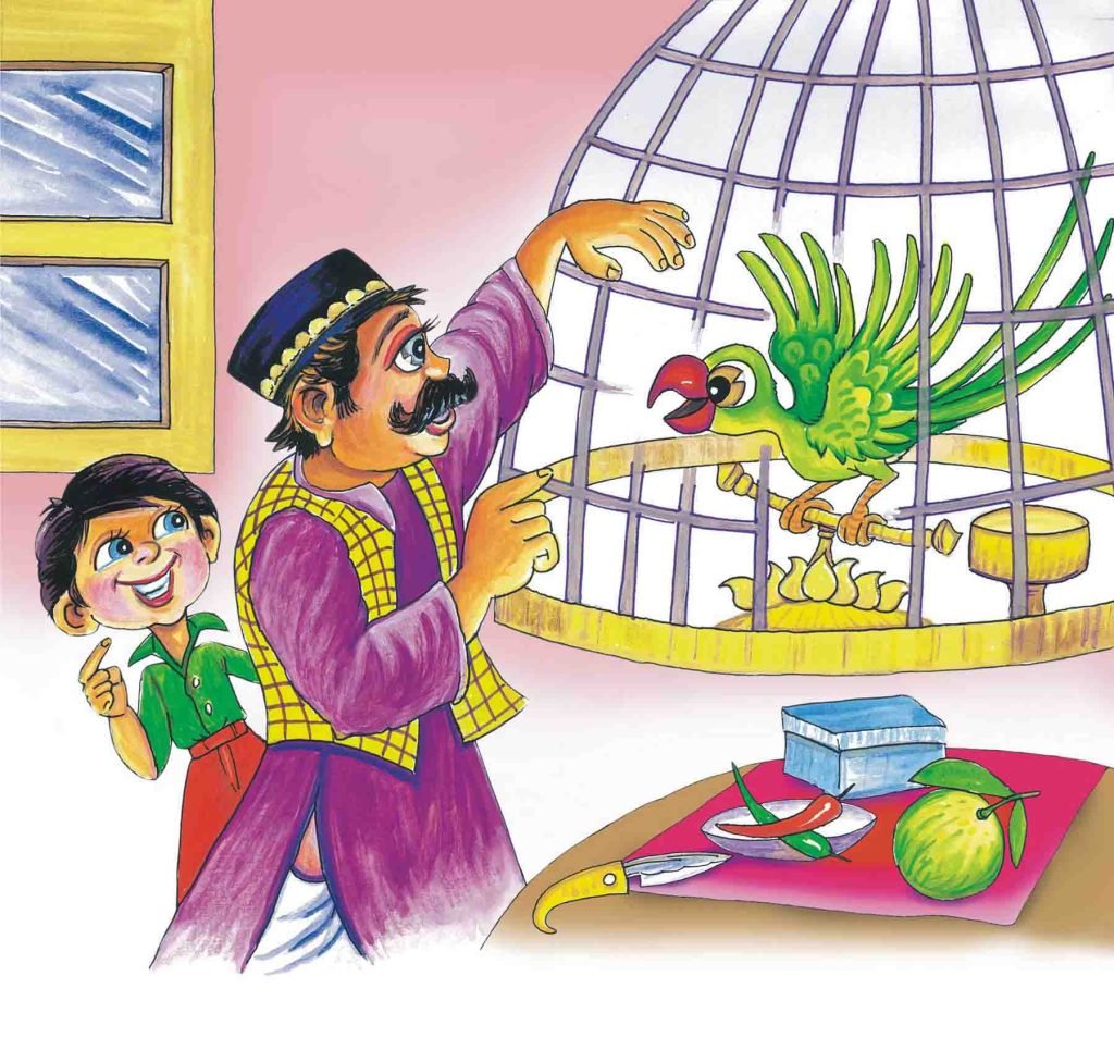 He brought a beautiful golden cage for the parrot, which had a bar, a swing and a bowl for water. In the golden cage, the parrot was given its favourite food—chillies, guavas and pomegranates. Ramlal and his children would often talk to the parrot, and the parrot learnt to speak a few words.