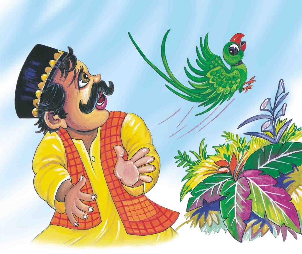 When Ramlal awoke, he saw a flock of parrots around him. ‘How nice it would be if I took one of them home as a pet!’ he thought. Ramlal threw his shoulder scarf on the flock of parrots and caught one. Reaching home Ramlal named the parrot, Totaram.