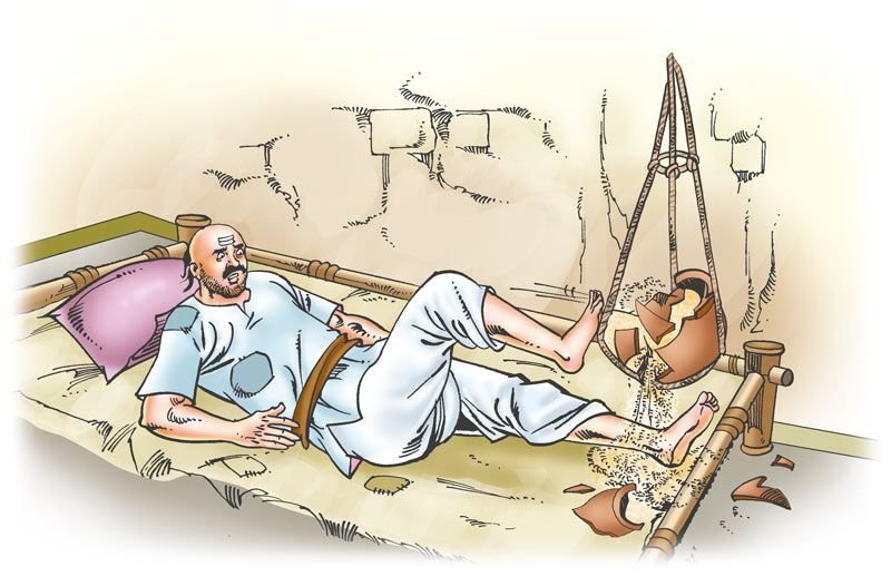 The Brahmin began to move his legs rapidly while he was still asleep. In doing so, he hit the earthen pot with one of his legs which was full of food. The pot broke and the food contents were spilled all over the floor. The Brahmin woke up. He saw that he was still in the bed. All the edible items kept in the pot were scattered on the ground and became unfit for eating. All this happened because of his day-dreaming.