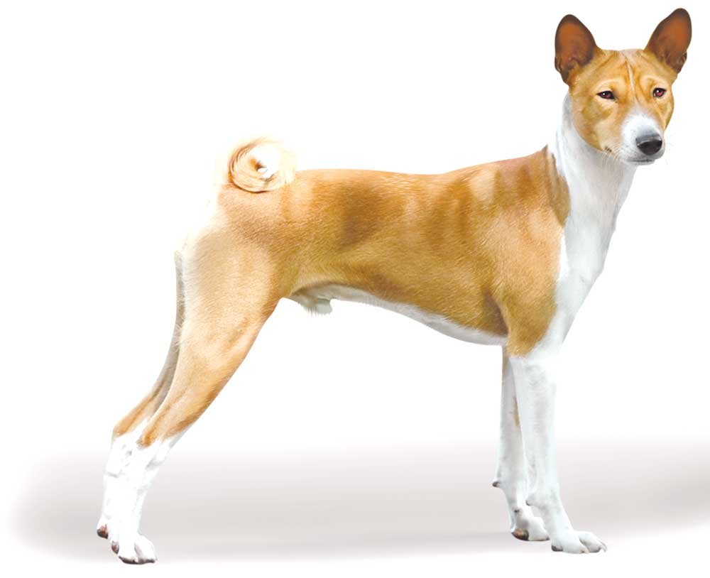 The basenji is characterized by forward pointing ears. It belongs to the hound group and a pariah type as well, which explains why it is preferred as a hunting dog. It breeds once a year, a litter may have four to six puppies. The dogs suffer from a disorder called the Fanconi syndrome which afflicts the kidneys.