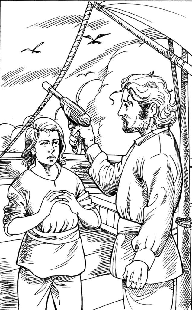 As I had the helm, I ran the boat out near a league farther, and then brought her to, as if I would fish. When, giving the boy the helm, I stepped forward to where the Moor was. Making as if stooping for something behind him, I took him by surprise with my arm under his legs, and tossed him clear overboard into the sea. He rose immediately, for he swam like a cork, and called to me, begged to be taken in. He told me he would go all over the world with me. He swam so strong after the boat that he would have reached me very quickly, there being but little wind. Upon which I stepped into the cabin, and fetching one of the fowling pieces, I presented it to him, and told him I had done him no harm, and if he would be quiet I would do him none. So he turned himself about and swam for the shore. I make no doubt but he reached it with ease, for he was an excellent swimmer.