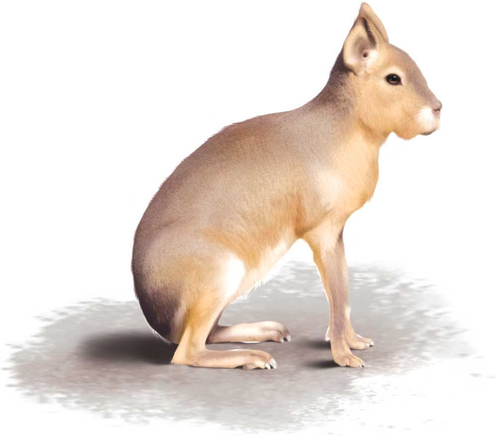 The animal resembles a wild hare; its tail is not visible and larger members of the species weigh almost 36 kilograms and grow to about 52 inches in length. Typically found in scrubland and forests, the cavy lives in groups of six or eight members; they are territorial and colonial, living in groups. They live in dens abandoned by other mammals.