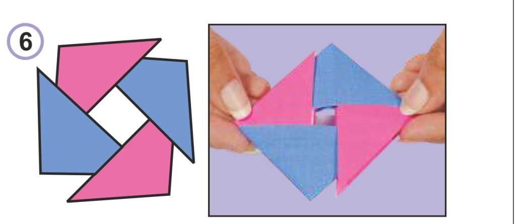 First, make 2 pairs by inserting the coloured pieces into the white pieces as shown above and then put these 2 halves together as shown in fig. 4.