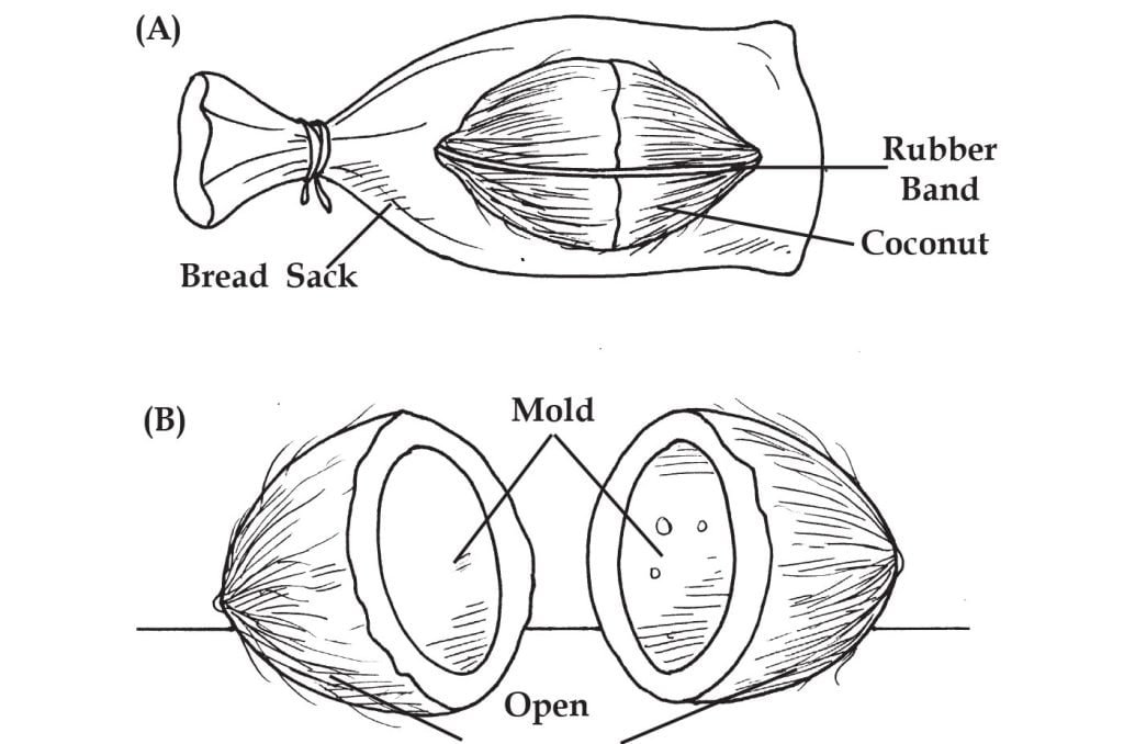 Place the coconut in a bread sack and place in a warm dark place for one week. Look at the outside and inside of the coconut daily for any growth.