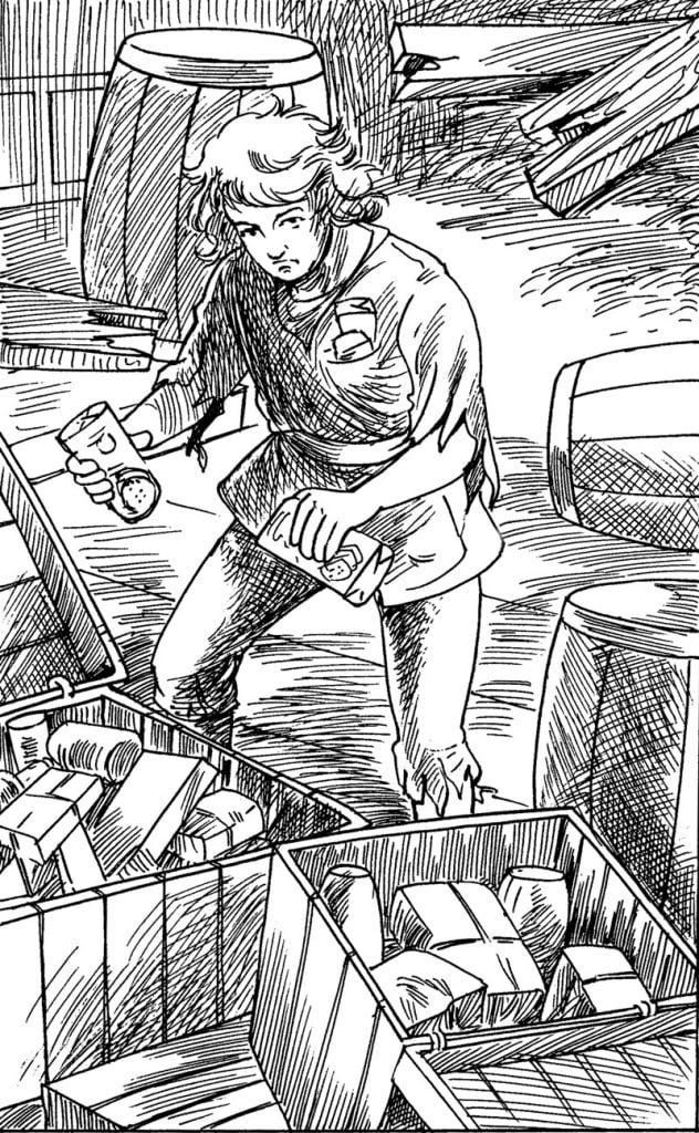 My raft was now strong enough to bear any reasonable weight. My next care was what to load it with, and how to preserve what I laid upon it from the surf of the sea. But I was not long considering this. I first laid all the planks or boards upon it that I could get, and having considered well what I most wanted, I first got three of the seamen’s chests, which I had broken open and emptied, and lowered them down upon my raft. The first of these I filled with provisions—namely, bread, rice, three Dutch cheeses, five pieces of dried goat’s flesh, which we lived much upon, and a little remainder of European corn which had been laid by for some fowls which we brought to sea with us; but the fowls were killed. There had been some barley and wheat together, but to my great disappointment I found afterwards that the rats had eaten or spoiled it all. As for liquor I found several cases of bottles belonging to our skipper, in which were some cordial waters. These I stowed by themselves, there being no need to put them into the chest, nor no room for them.