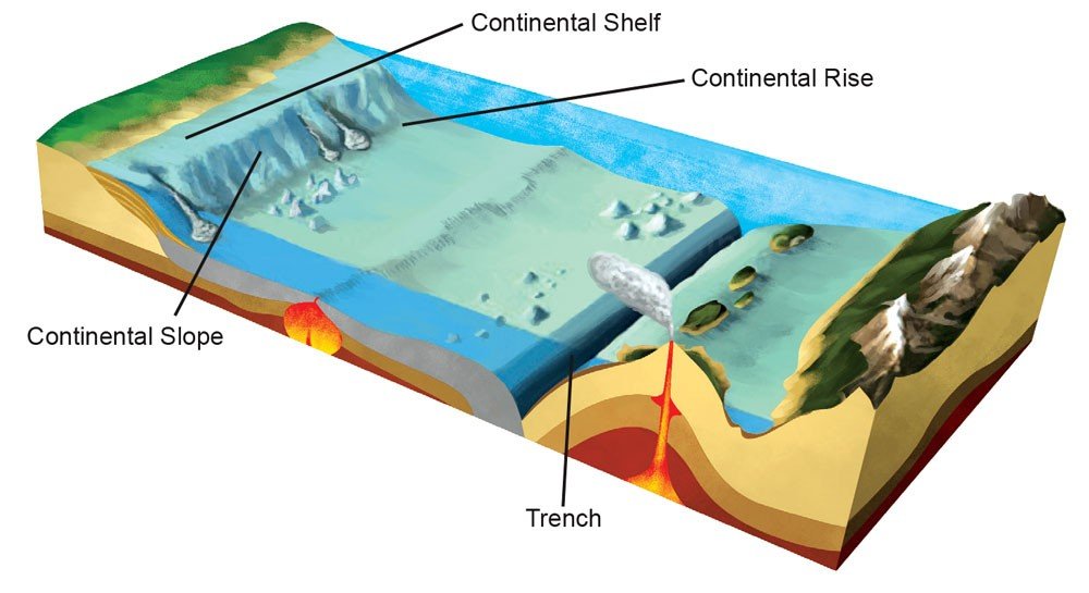 The ocean floor has many interesting physical features. The crust of the ocean floor is made up of a thin layer called basalt, a type of volcanic rock. The main features of the ocean floor are: