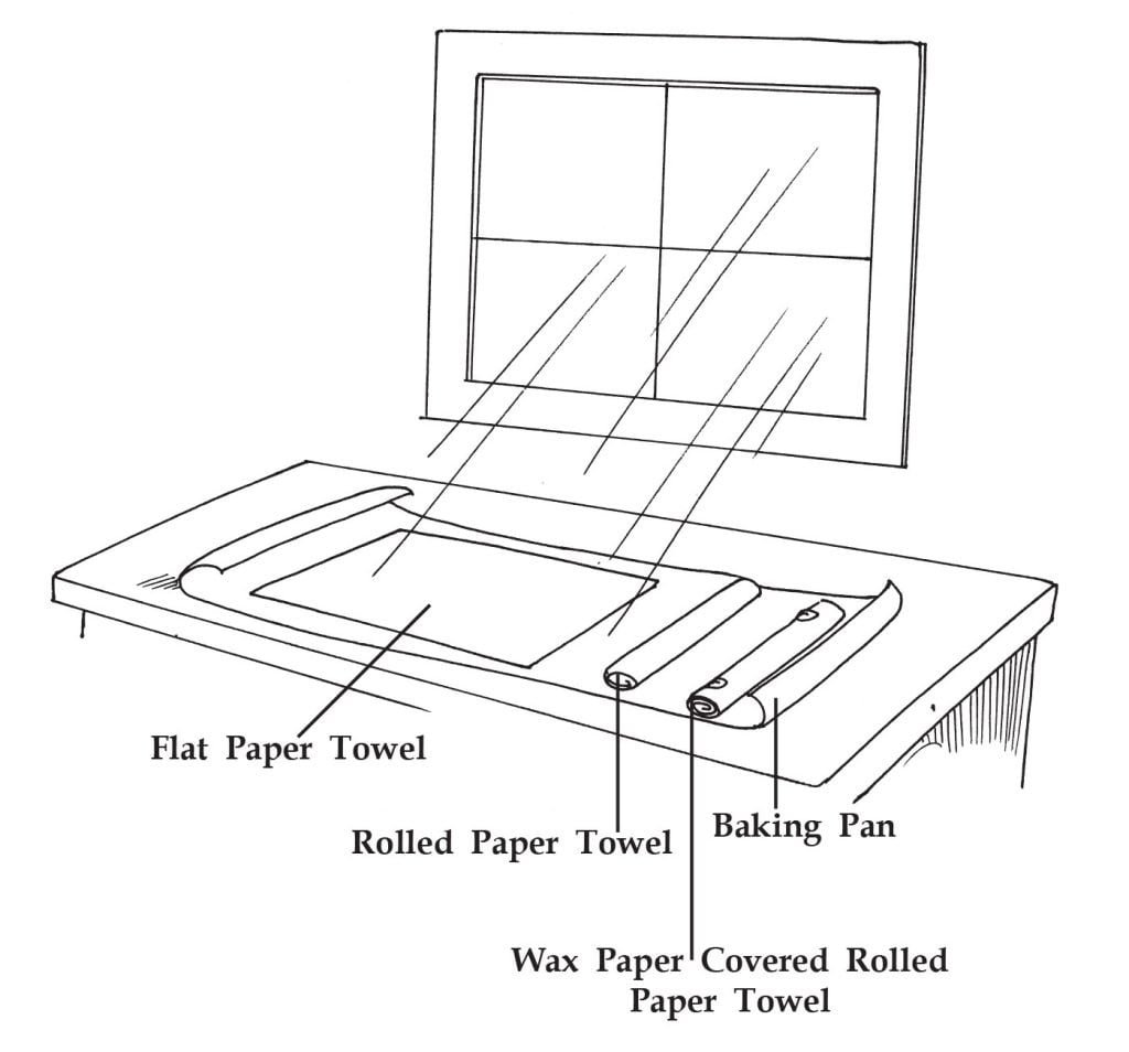 Dampen the paper towel sheets with water. They should be wet, but not dripping. Lie one paper towel flat on the baking sheet. Roll up a second paper towel and place it next to the flat one on the pan. Roll the last paper towel as you did the second one, but cover the outside of the roll with waxed paper. Secure the ends, top and bottom, of the waxed paper roll with paper clips.
