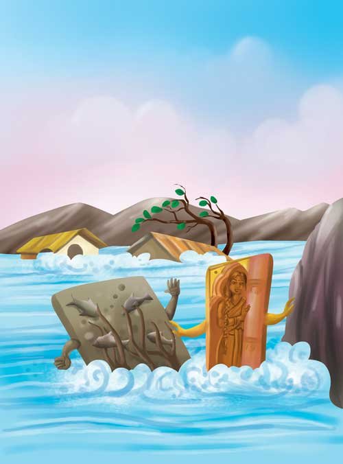 Once upon a time, it rained heavily for several days resulting in floods. Many houses collapsed and household articles got carried away with the flood-water. As a matter of chance, two pitchers were also carried away by the flowing tide. One of them was made of brass while the other of baked clay. The brass pitcher was so strong, that, it could be tossed against anything. But the clay pitcher was in ever-present danger of being broken if it got struck against something. The clay pitcher was alarmed by danger. The brass pitcher looked at it and said, “Brother! Be close to me; I shall protect you in every way.” The clay pitcher thought wisely and retorted, “Brother! It would surely be worse for me, if we come closer. If I keep at a distance from you, I may float to safety.” So, the clay pitcher stood away from the brass pitcher and safely reached the shore.