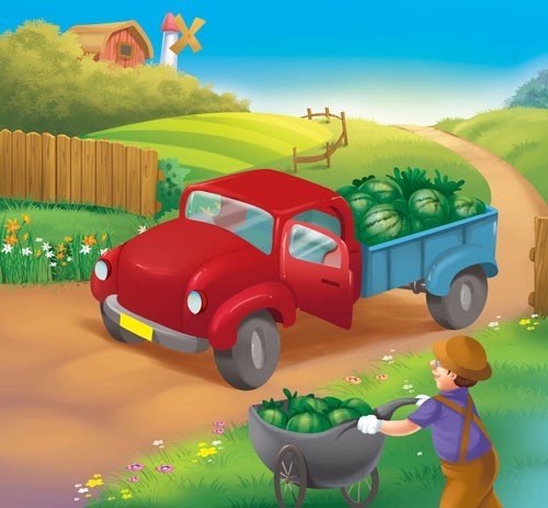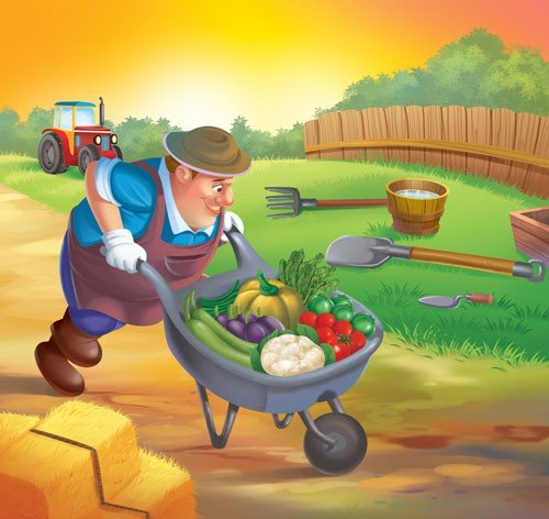 Farmers use tractors, wheelbarrows, shovels and rakes to work on the farm.