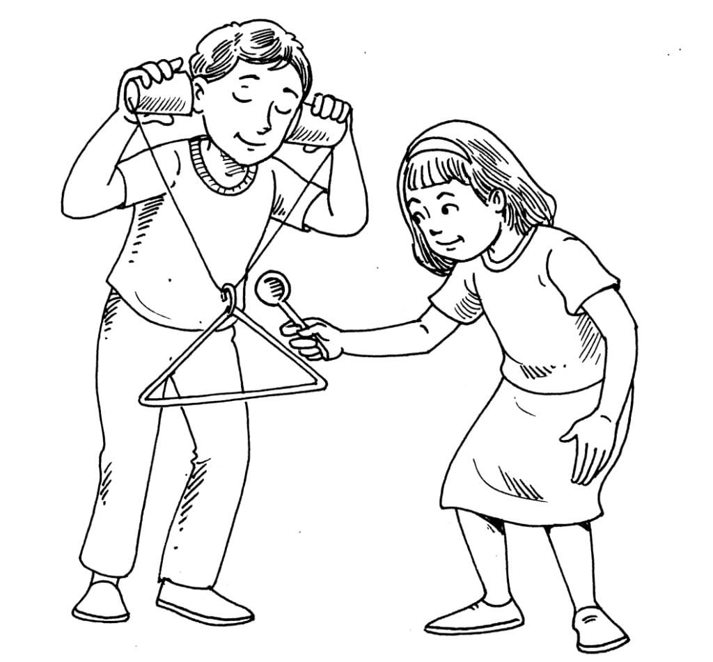 Sound travels very well through solid materials. When the hanger was struck by the spoon, it vibrated. These vibrations were transferred to the string. The string carried these back-and-forth movements to the cups. There, the vibrating cup bottoms set the air space in motion.