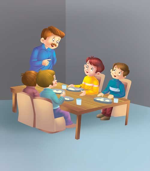 Once, a teacher invited his students to a meal. The food was served. They said their prayers. The students were about to eat when the teacher said, “Wait, dear students. Here is a small test for you. Do eat, but do not bend your arms. Now you may begin.” Then, the teacher left. The students were puzzled. How could they eat without bending their arms? Was the teacher playing a trick on them? Suddenly, a clever student spoke up. He said to the other students, “Let us each feed the student in front of us. In this way, all of us can eat with our arms held straight!” The teacher came back. He saw the students enjoying the meal. Each student had helped the other. The teacher was happy. His students had passed the test. If the students had not helped one another, they would not have been able to eat. When we help one another, all of us are happy.