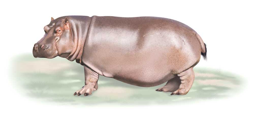 It has a large, almost hairless body with a grey-coloured skin, a barrel-shaped torso, large mouth and teeth and stubby legs. Their eyes and nostrils are located high on their heads, and they can spend up to 16 hours a day with the rest of their bodies submerged in water. Their diet consists almost entirely of grass and rarely some aquatic animals.