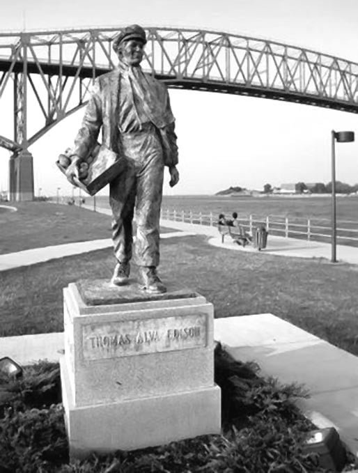 As a memorial stands the statue of Thomas Alva Edison on St. Clair river.