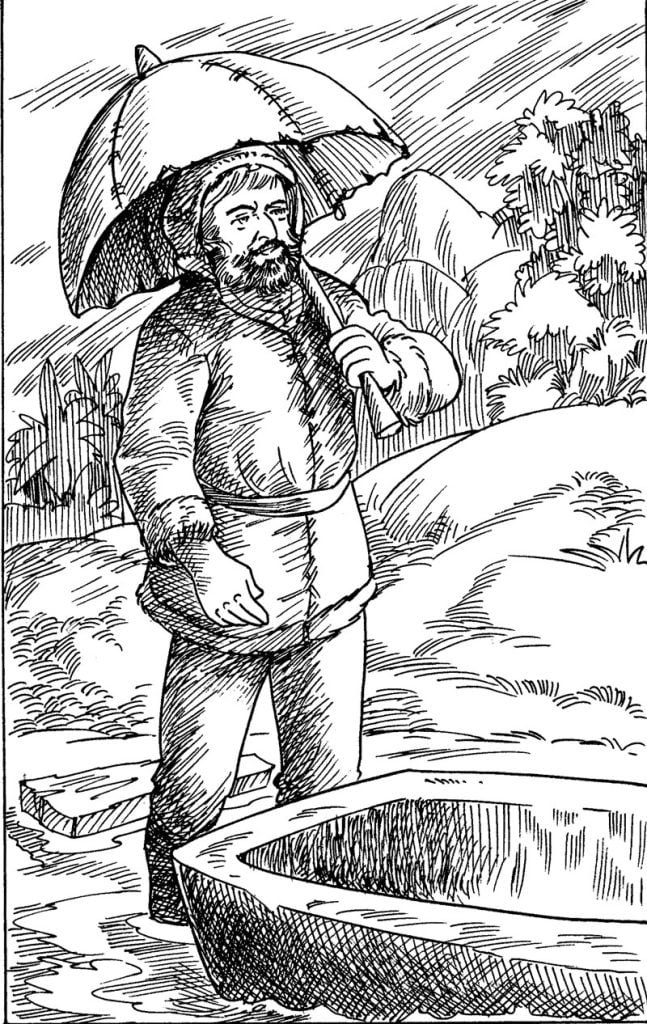 I saved the skins of all the creatures that I killed—I mean four-footed ones—and I had hung them up stretched out with sticks in the sun, by which means some of them were so dry and hard that they were fit for little, but others it seemed were very useful. The first thing I made of these was a great cap for my head, with the hair on the outside to shoot off the rain; and this I performed so well, that after this I made me a suit of clothes wholly of skins—that is to say, a waistcoat and breeches open at knees, and both loose, for they were rather wanting to keep me cool than to keep me warm. I must not omit to acknowledge that they were wretchedly made; for if I was a bad carpenter, I was a worse tailor. However, they were such as I made very good shift with. And when I was abroad, if it happened to rain, the hair of my waistcoat and cap being outermost, I was kept very dry.