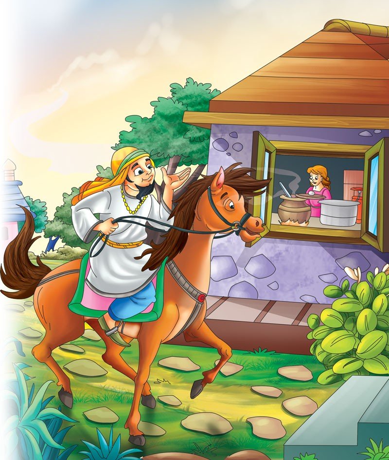 They thought he was the owner’s friend too and the owner thought that he was the friend of his two friends. He gave sumptuous food and treated him well. There, he saw a beautiful damsel, the sister of the owner. She was playing upon the flute and he too played upon the flute after which the damsel was very happy.