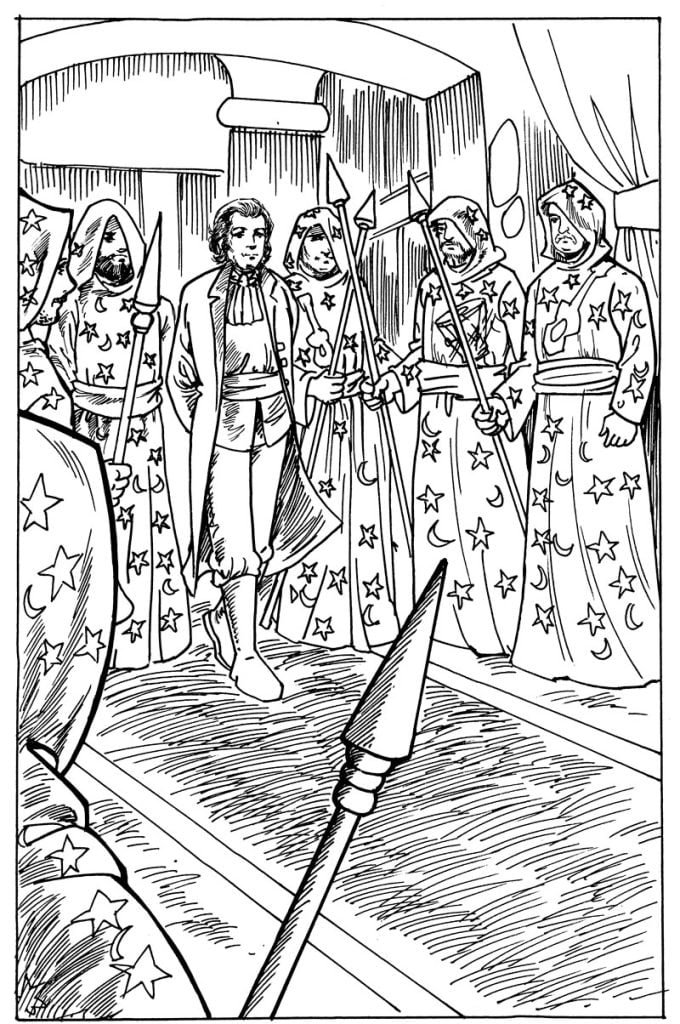 We arrived at the island at about eleven in the morning. One of the gentlemen who accompanied me went to the governor, and desired admittance for me. This was immediately granted, and all three of us entered the gate of the palace. We passed between two rows of guards who were armed and dressed in a very antics manner. We passed through several apartments until we came to the chamber of the king. Before we entered, we were asked a few general questions. Then we were permitted to sit on three stools near the lowest step of Majesty’s throne. He understood the language of Balnibarbi, although it was different from that of the island.