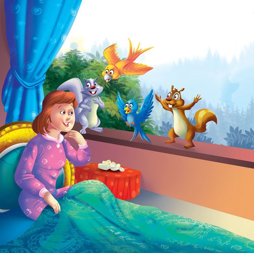 Princess Katie scattered seeds and grains for the birds and the squirrels. They had become so used to her and loved her so much that they would come and peck the grains from her hands and sit on her shoulders. But one morning, Katie did not come out. The birds and the squirrels were very worried. They flew to the windows of the palace and finally came to her room. Princess Katie was ill! The squirrels also scurried up to the window-sill and peeped in. They whispered to one another and decided they must do something to make her feel well. They ran to the kitchen and picked up the little bits of cake, cheese and pie. They rushed back and put all the things on the table near her bed. When Katie recovered, she was amazed to see the little morsels on the table and a row of birds and squirrels on the window-sill! She got well soon!