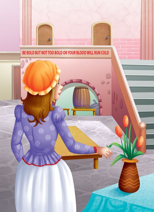 Lady Mary was beautiful and had two brothers. She lived in her father’s mansion in the countryside. There were many suitors for her hand, but she was in love with Mr Fox who came often to meet her at her father’s house. Although he seemed brave and rich, and spoke about his castle, he did not invite her or her brothers to it. It was decided that they were to marry, but Mr Fox had to go away for a while. Lady Mary, being on her own, decided to see his castle. When she found it, she admired its fine walls and moat and found ‘Be Bold’ written on the gate. On the inner door was written ‘Be Bold, but not too bold!’ And in the hall was written ‘Be Bold but not too bold, or your blood will run cold!’ Wondering at all this, she went upstairs and opened a door.