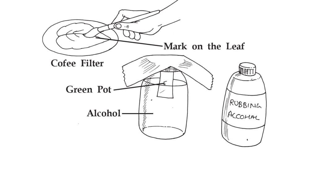 Place the leaf, top side down, on the edge of the coffee filter. Rub the pencil lead back and forth ten times over the leaf about one half inch (13 mm) from the edge of the paper. Rotate the leaf and repeat step two. Continue moving and marking on the leaf until a single dark green spot forms on the filter paper.