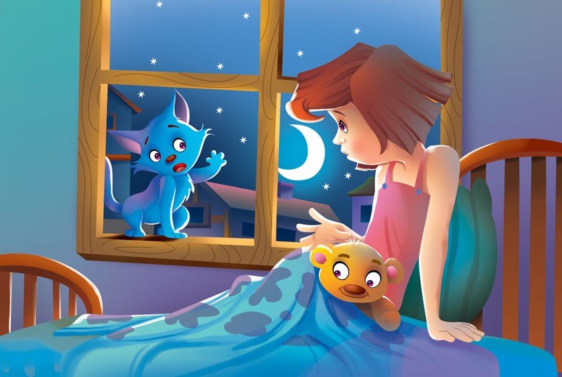 One night when Mattie was falling asleep, she heard a sound like someone tapping on her window pane. She sat up and saw a beautiful blue cat on the window sill. It was pawing the window and purring.