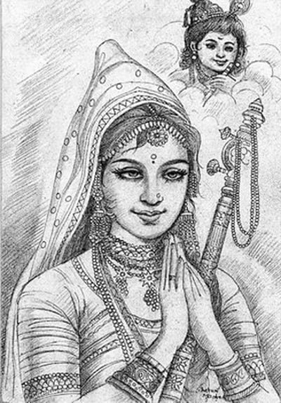 Mirabai was born in an aristocratic family of Rajputs at Merta in Nagaur District of Rajasthan. Her mother gave her a figurine of Lord Krishna when she was six years old, with which she always played, sang and talked. In 1516, she was married to the Prince of the Rajput kingdom of Mewar, Raja Bhoj.