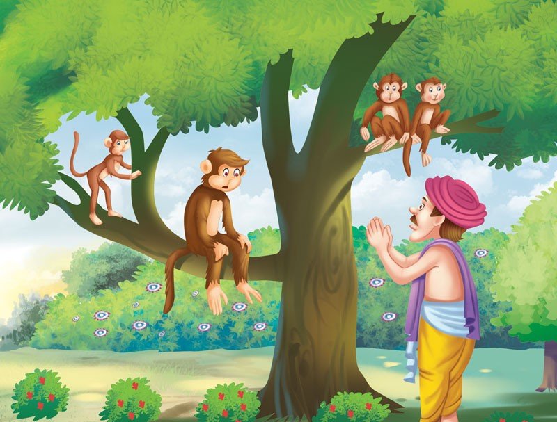 In the pleasure garden, there lived a troop of monkeys. They loved the trees and the fruits of the garden and they did not hurt anyone. The gardener finally had a bright idea, “I’ll ask the monkeys to take care of the garden!”
