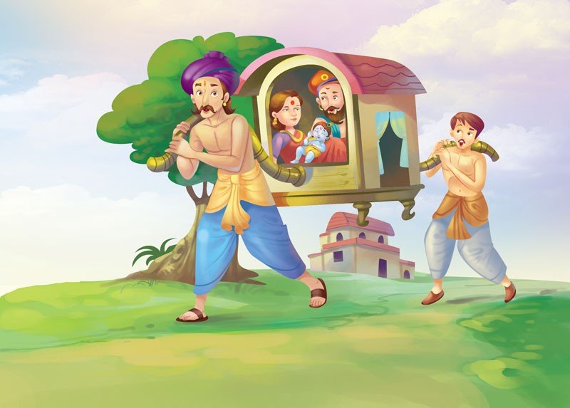 After taking leave of Vasudeva in Mathura, Nanda climbed into a palanquin with his child and wife. He told his wife Yashoda about what Vasudeva had said. Nanda and Yashoda felt joy to see their child chuckle with laughter upon reaching Gokul. Lord Krishna’s radiance was bright. His eyes shone like the stars and His sweet smile enchanted everyone. Lord Krishna’s mighty powers would soon reveal to the people of Gokul as well as to Nanda and Yashoda.