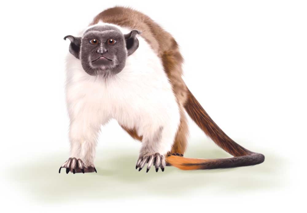 It has a white chest and back, brown, tan or red hind legs and tail and a black hairless face. Its diet consists of fruits, insects and plants, small rodents and reptiles, eggs and tree sap. They are mostly diurnal and arboreal. Usually females give birth to twins, which are like adults-hairless in the face.