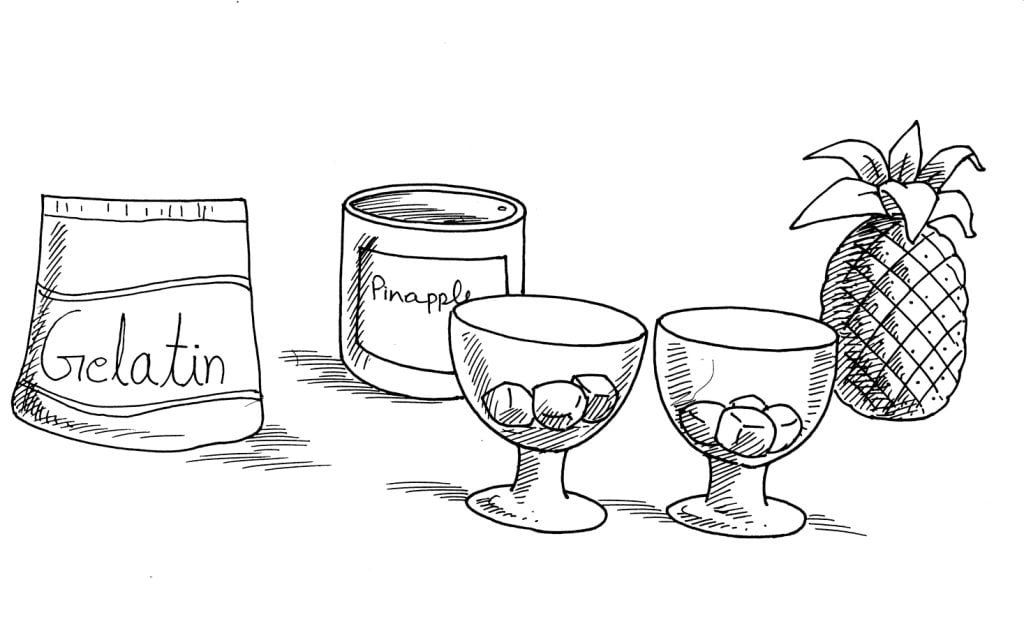 Gelatin is a protein that comes from the connective tissue in the hoofs, bones, tendons, ligaments and cartilage of animals. Vegetable gelatin, agar, is made from seaweed. Gelatin dissolves in hot water and hardens with cold. We can put all kinds of fruit in it to make terrific desserts-but we’re told on the package not to add raw pineapple. Why?