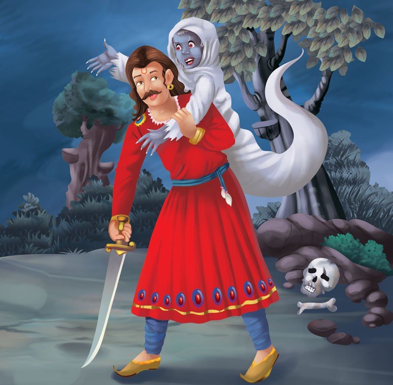 King Vikramaditya reached the tree, pulled down the dead body and putting it on his shoulder proceeded towards his kingdom. Baital said to him, “I will tell you a story to pass the time. Take note and reply to my questions honestly.” Then Baital told the story as follows: