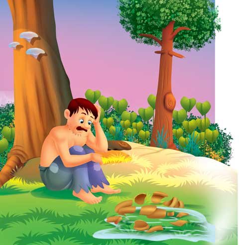 Once, there was a beggar named Ramu, who used to go door to door to beg. From begging he had collected a pot full of flour, which he had kept hanging over his cot. One day after begging, he lay on his cot and started dreaming, gazing at that pot. He was dreaming that he would sell the flour and would get money. From that money he would buy a goat; that goat would bear many lamps. Then he would sell them and from that money he would buy a cow and the cow would bear calves. Then he would sell them and from that money he would buy precious jewels. And after becoming rich he would ask the king’s daughter to marry him. After marrying the princess he would be more rich. Then from her wife he would have a son, who would be loved most but whenever he would do any mischievous work he would be punished. Suddenly, Ramu in his dream kicked his leg and his pot of flour fell down and broke into a thousand pieces. The flour scattered on the floor and got wasted.
