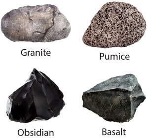 The four types of igneous rocks are: granite, obsidian, basalt and pumice. Almost 95% of the Earth’s crust is made up of igneous rocks.