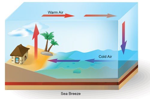The surface of the Earth warms up more quickly in the morning than the surface of the water. This is the reason the air above the beach becomes warmer and thinner creating low-air pressure. While the air above the sea is cooler and denser, creating high pressure. This difference in the air pressures creates the movement of the wind from high-pressure areas to low-pressure areas. Hence, cool air moves from the sea towards the land. This is called sea breeze, which blows during the day.