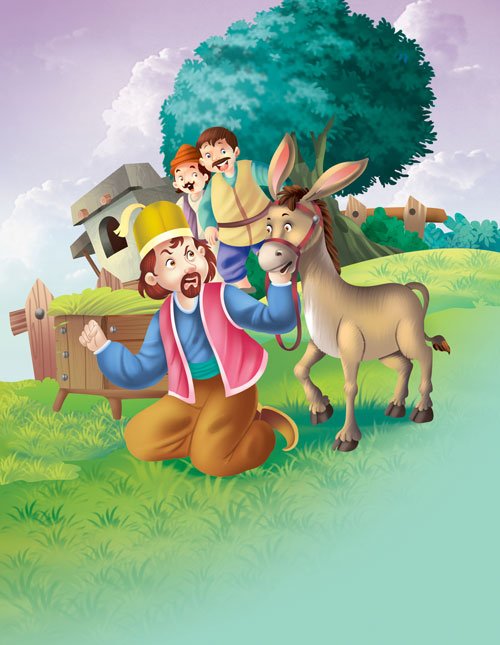 Sheikh Chilli’s donkey was stolen by some thugs. One of the thugs took away the donkey, while the other thug fooled Sheikh by saying that he was Sheikh’s donkey Hatimtai, now turned into a man. He also said that his mother had cursed him to be a donkey because of his foolishness. Sheikh went back home and related the sad story to his own mother. She didn’t believe in the story, but gave Sheikh some money anyway, to buy a new donkey. So, Sheikh went to buy a donkey at the fair. His donkey was there, too, which recognized Sheikh and brayed in joy. Sheikh shouted at the donkey, “You rascal, Hatimtai! So, your mother has cursed you once again! Surely, you must have done something foolish. Now come back to me.” Everybody laughed heartily seeing Sheikh talking to a donkey. And poor Sheikh bought his own donkey again!