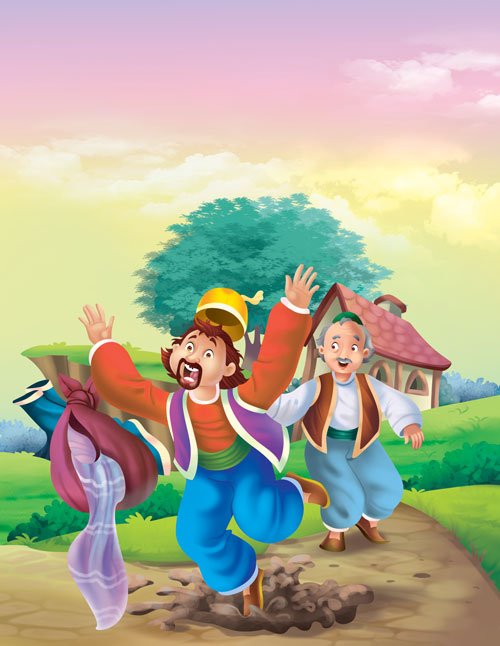 One day, Sheikh was going to a nearby town. On the way to the town, Sheikh saw that an old man was carrying a large bundle of clothes. As Sheikh passed him, the old man asked, “Son, if you help me carry my luggage to the town I will pay you thirty rupees.” Sheikh happily accepted the offer. The moment he placed the luggage on his head and started walking, Sheikh started dreaming. He dreamt, ‘I will buy a lot of kites from these thirty rupees and win the kite flying contest. Soon, with that prize money, I will buy a horse and ride it at a high speed. Tabdik Tabdik, Tabdik…’ Sheikh did not realise that while dreaming he had entered a mud pit. He lost his balance and soiled all the clothes that he was carrying. The old man was very upset, but Sheikh said furiously, “You are worrying about the clothes! What about the loss that I have faced? I lost my horse; do you know?” So saying, he walked off, leaving the old man wondering, what to do next!