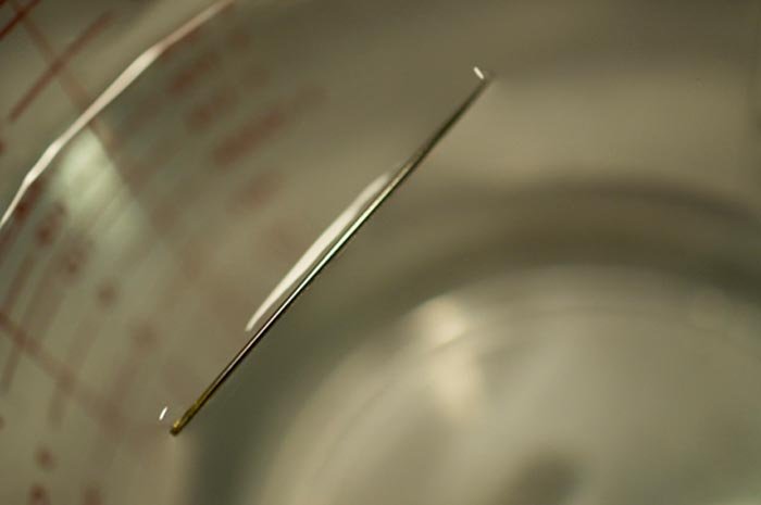 Dish soap! The molecules in dish soap separate the water molecules from one another, and since the surface tension of the water is no longer as great, the needle sinks!