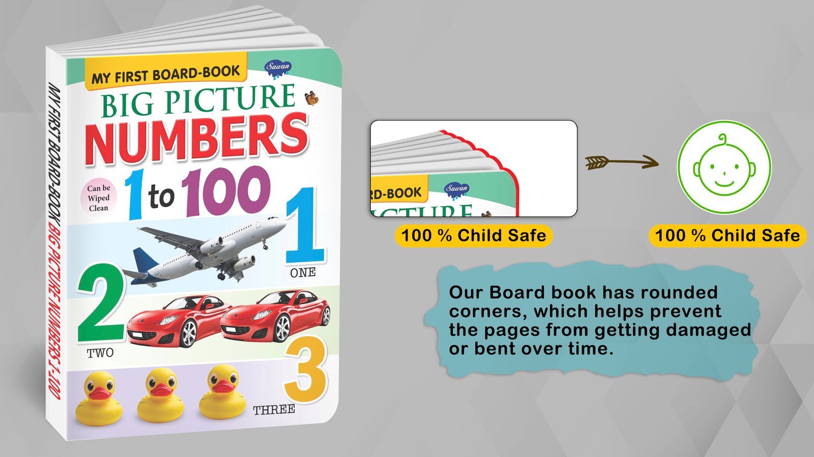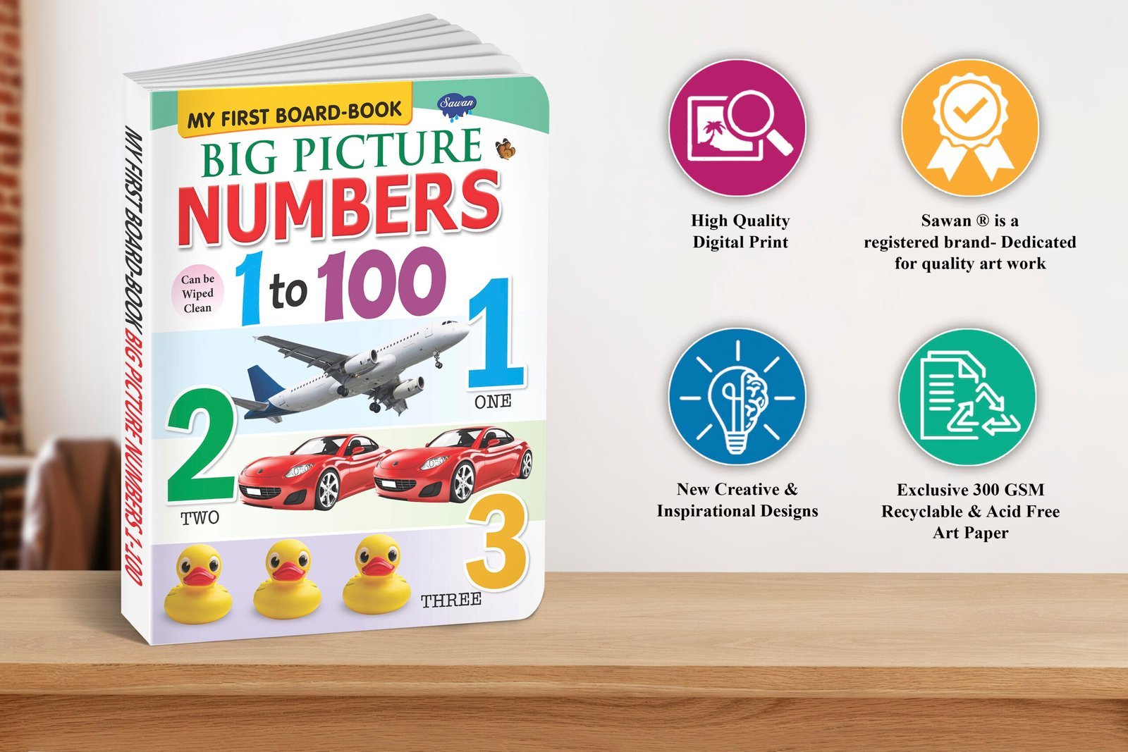 Sawan presents Big Pictures: Numbers 1 to 100 – – my first board book for children. A delightful book for young artists to have fun matching numbers with colours. The amazing pictures hidden behind the numbers will kindle the curiosity of children and give them hours of colouring fun. The book will help develop the child’s concentration, motor skills and observation skills.