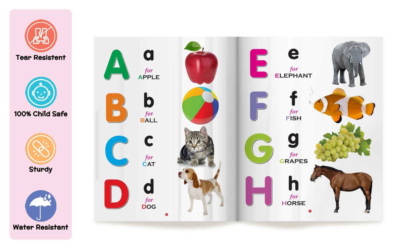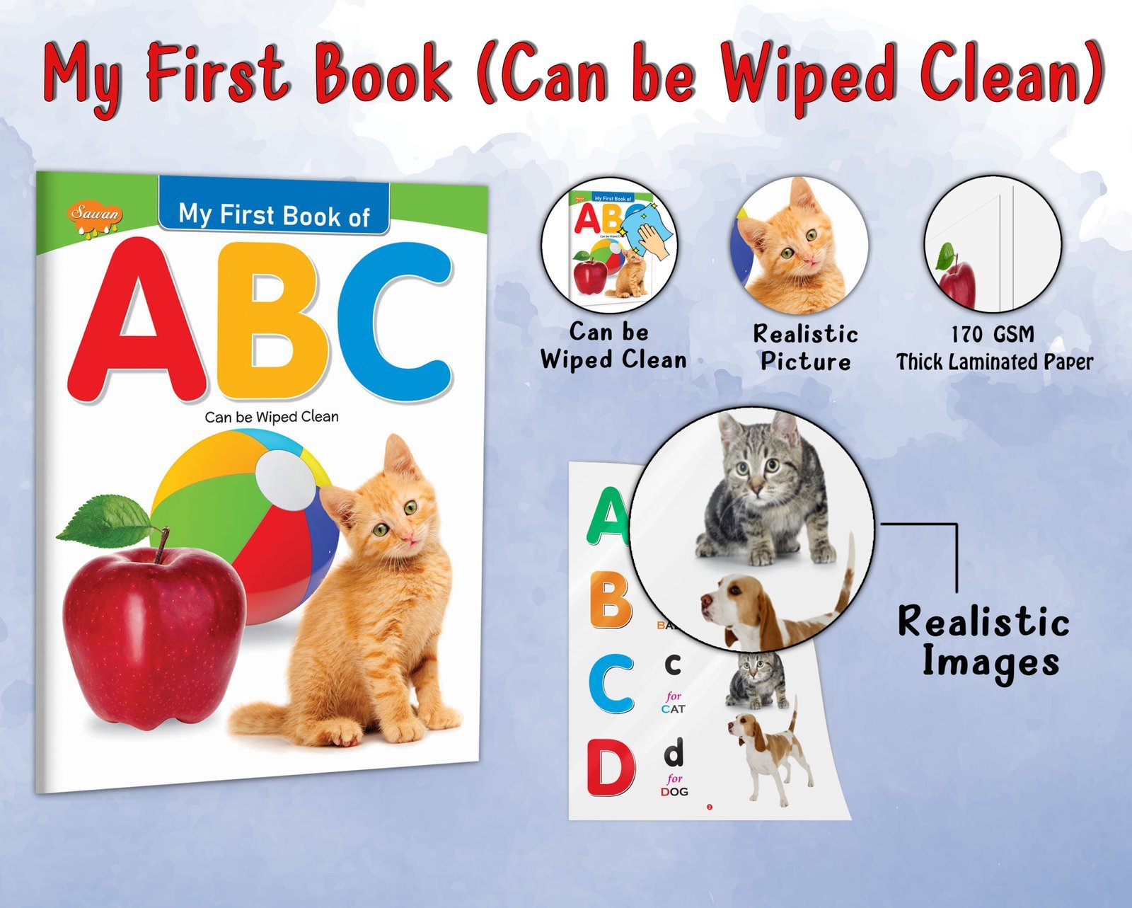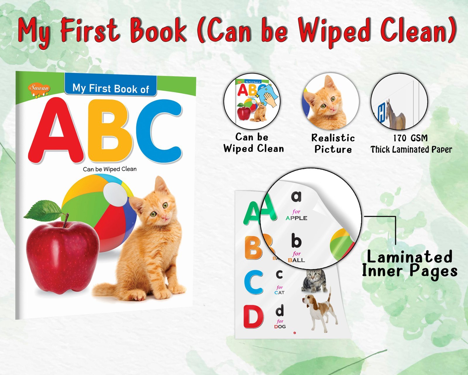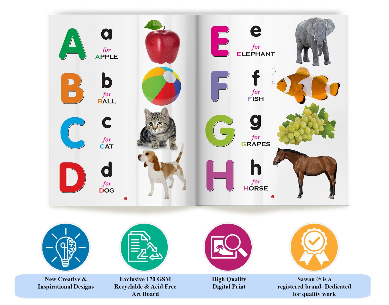 “ABC” is a captivating early learning book for kids that belongs to the My First Book series by Sawan Books. With its wipe-clean pages, children can actively engage in learning as they explore the alphabet. The book features approximately 8 pages of durable board paper, ensuring longevity and easy handling. Each page is beautifully adorned with four-colour, laminated illustrations depicting realistic pictures that make the alphabet come alive. Designed as an early learning tool, this interactive book introduces children to the joys of language development, making it a perfect resource for young learners on their educational journey.