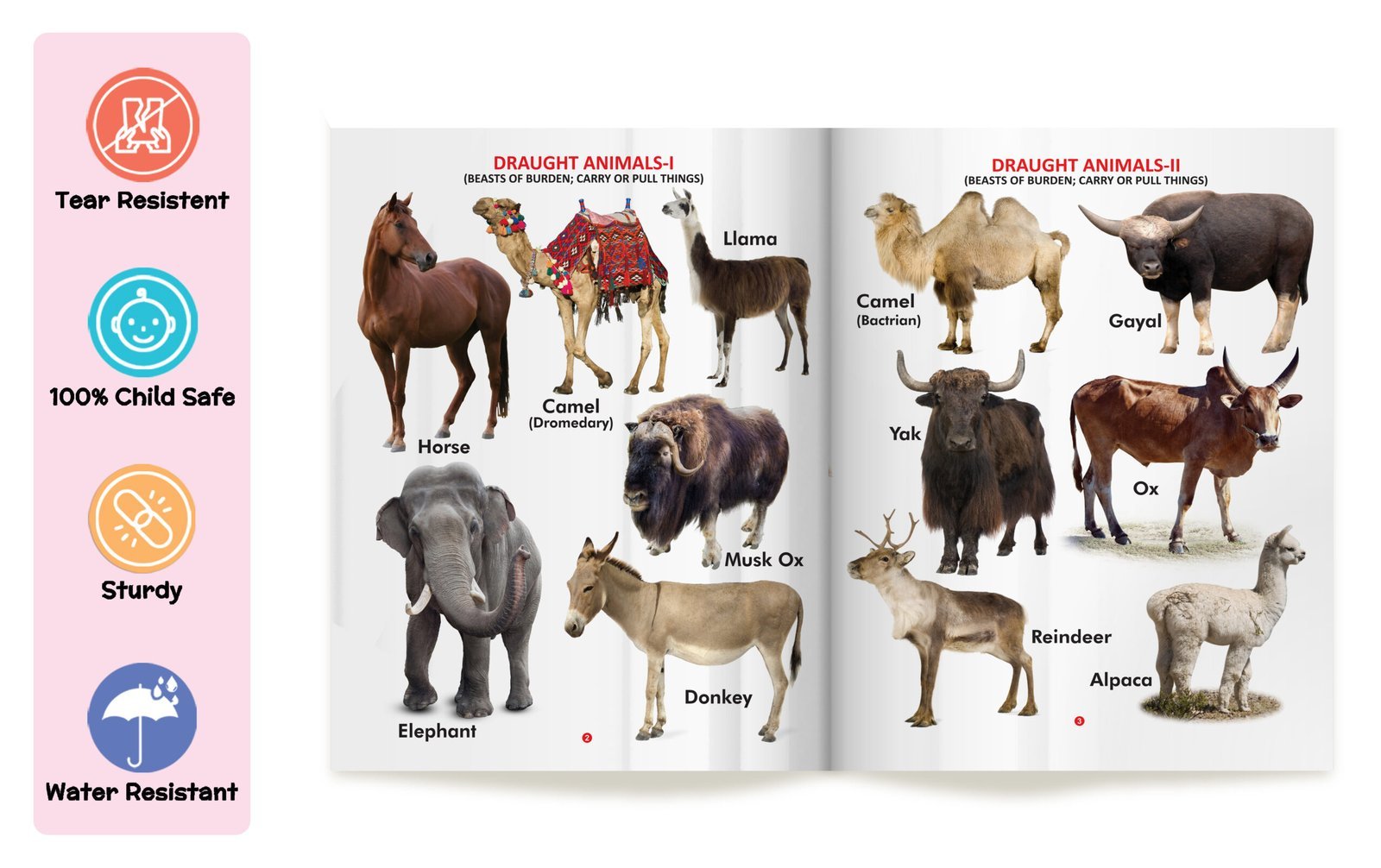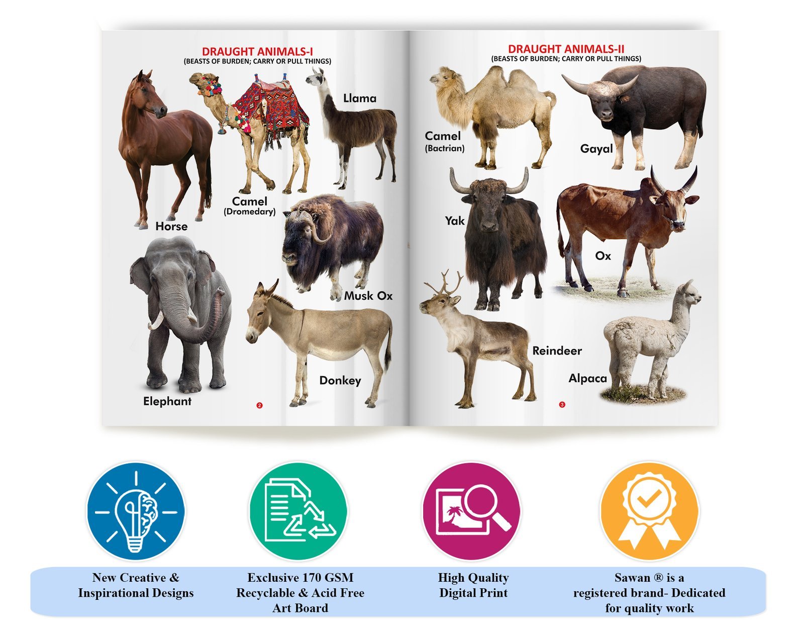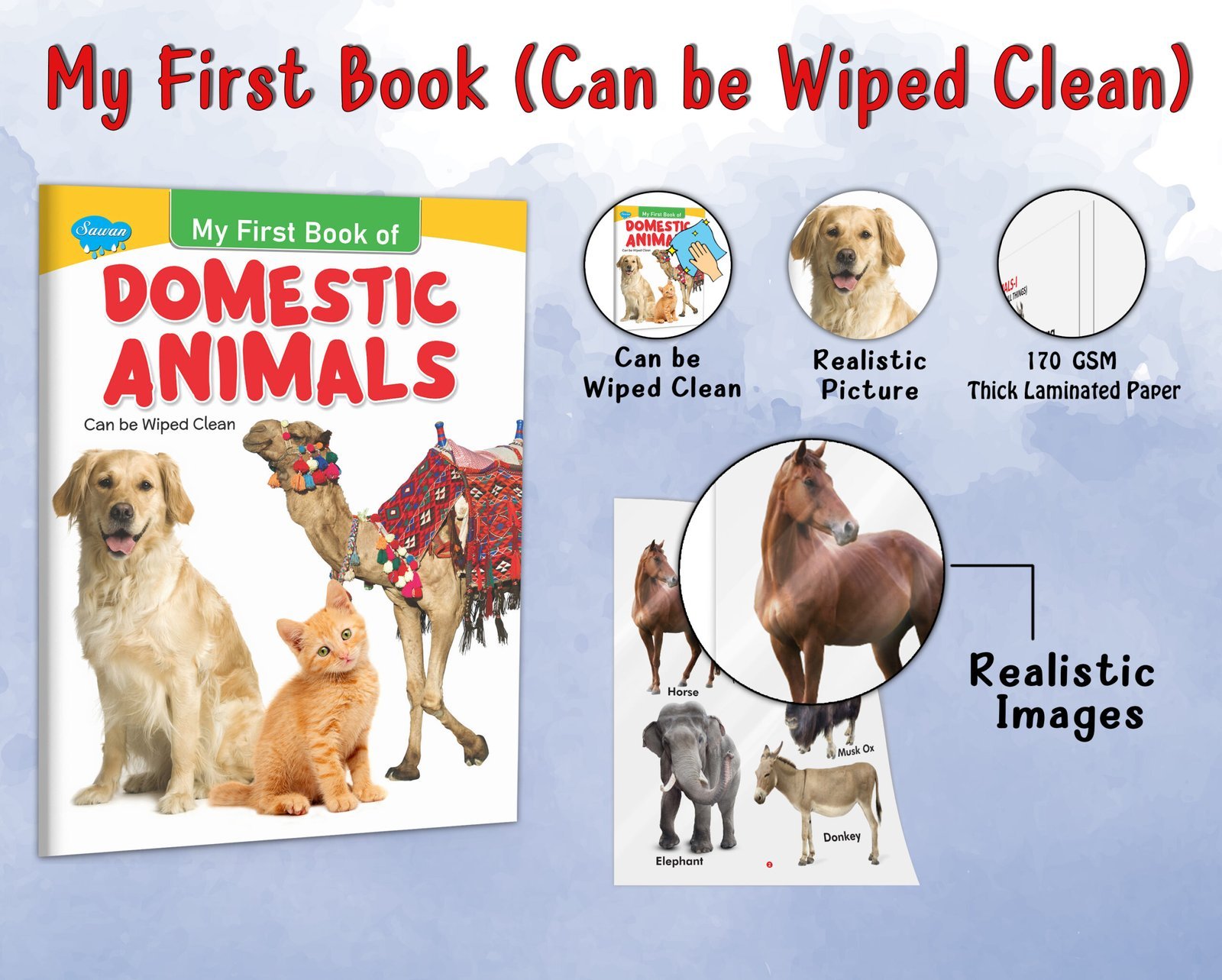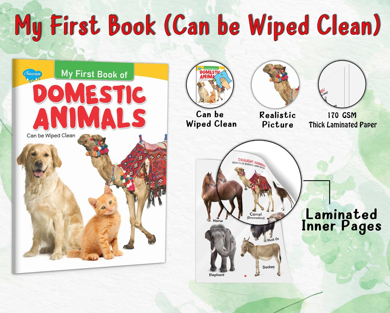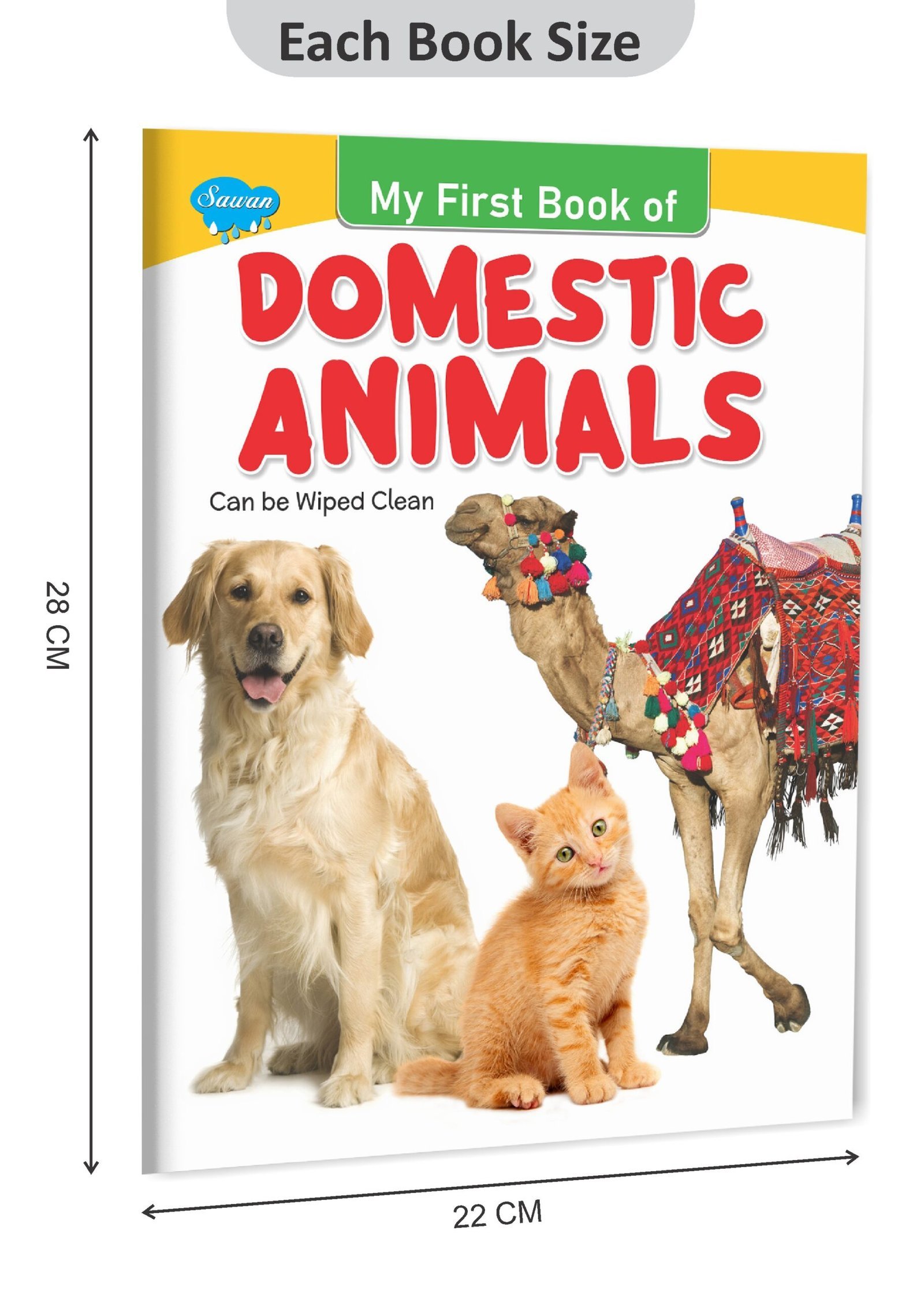 “Domestic Animals” is an engaging early learning book for kids in the My First Book series by Sawan Books. With its wipe-clean pages, children can actively participate in learning about various domestic animals. This book comprises approximately 8 pages of durable board paper, ensuring longevity and easy handling. Each page features four-colour, laminated illustrations with realistic pictures that vividly depict a range of domestic animals. Designed as an early learning resource, “Domestic Animals” introduces children to familiar animals found in homes and farms, fostering their curiosity and expanding their knowledge of the animal kingdom interactively and educationally.