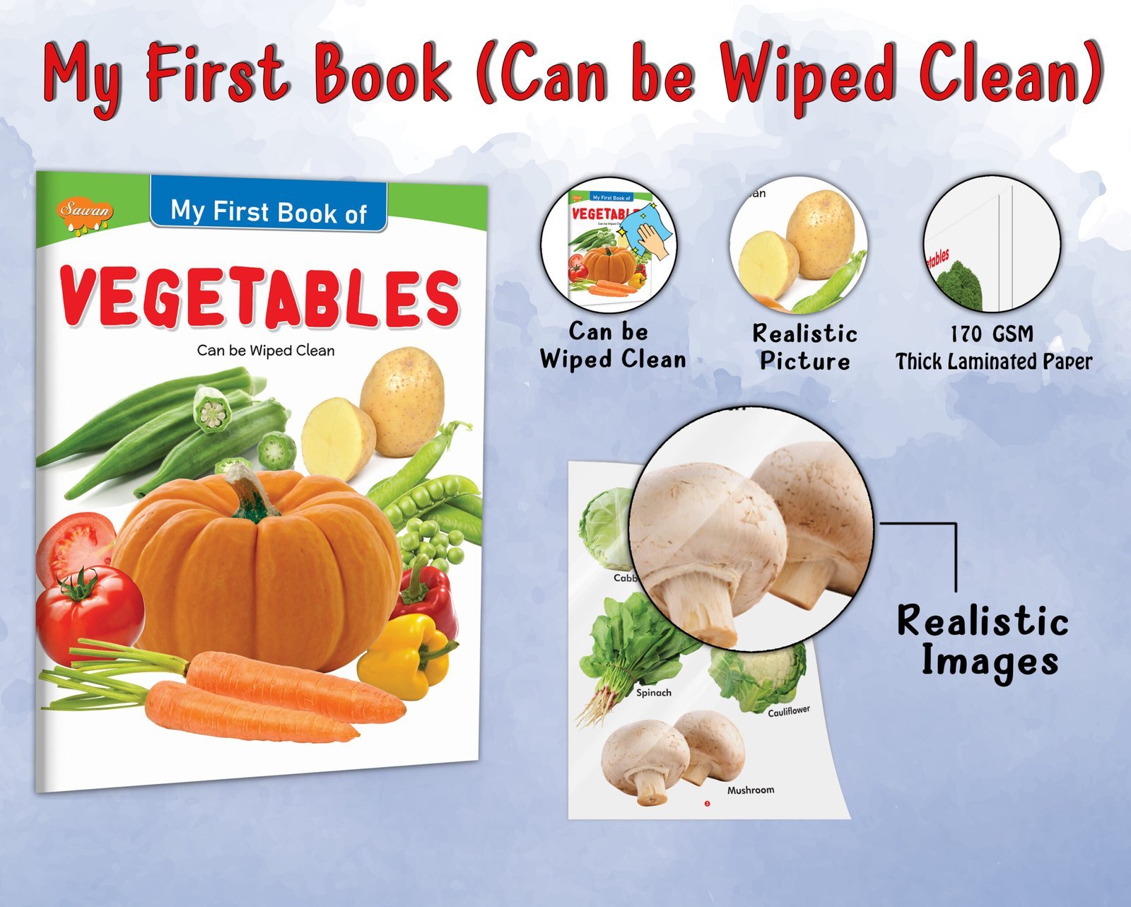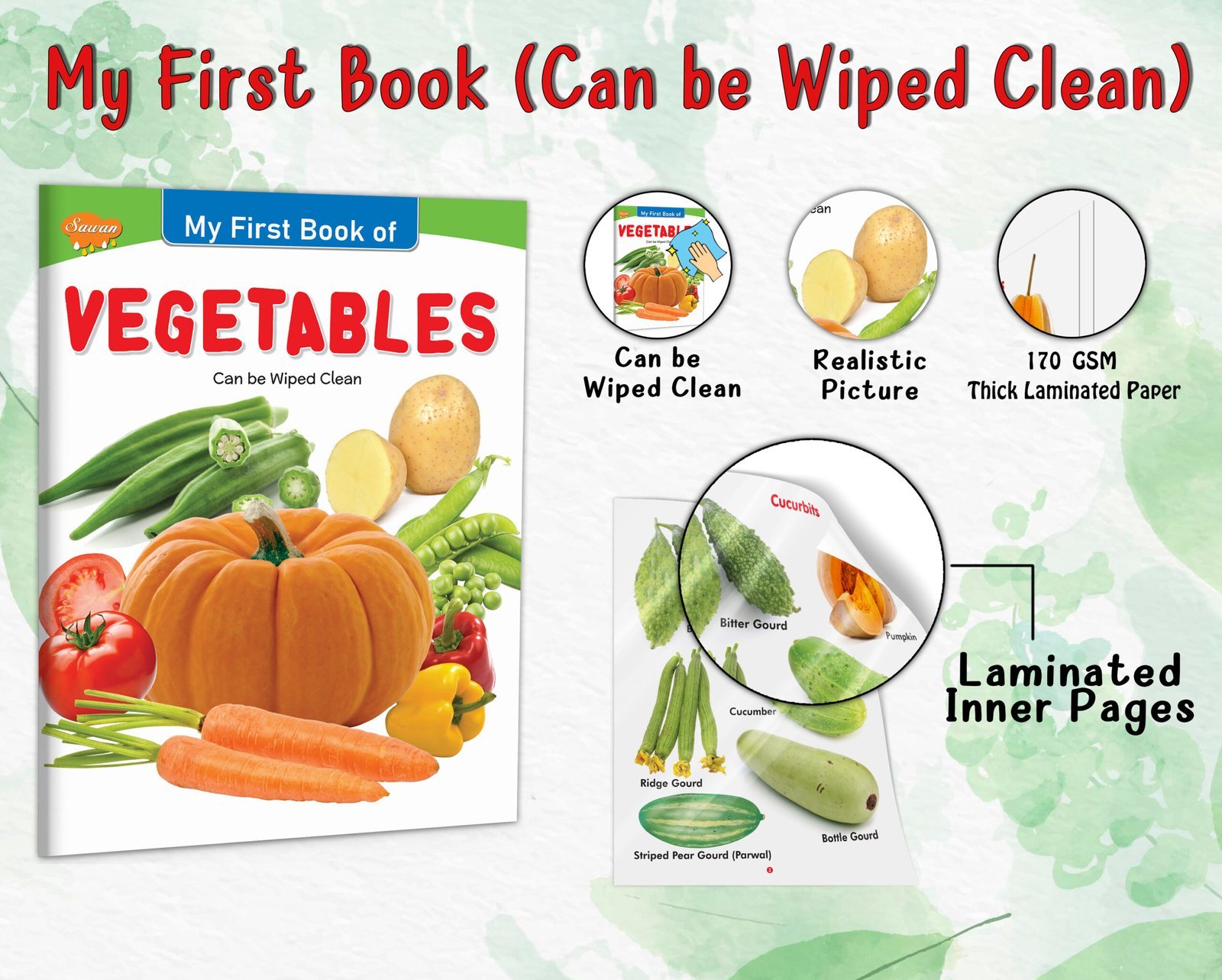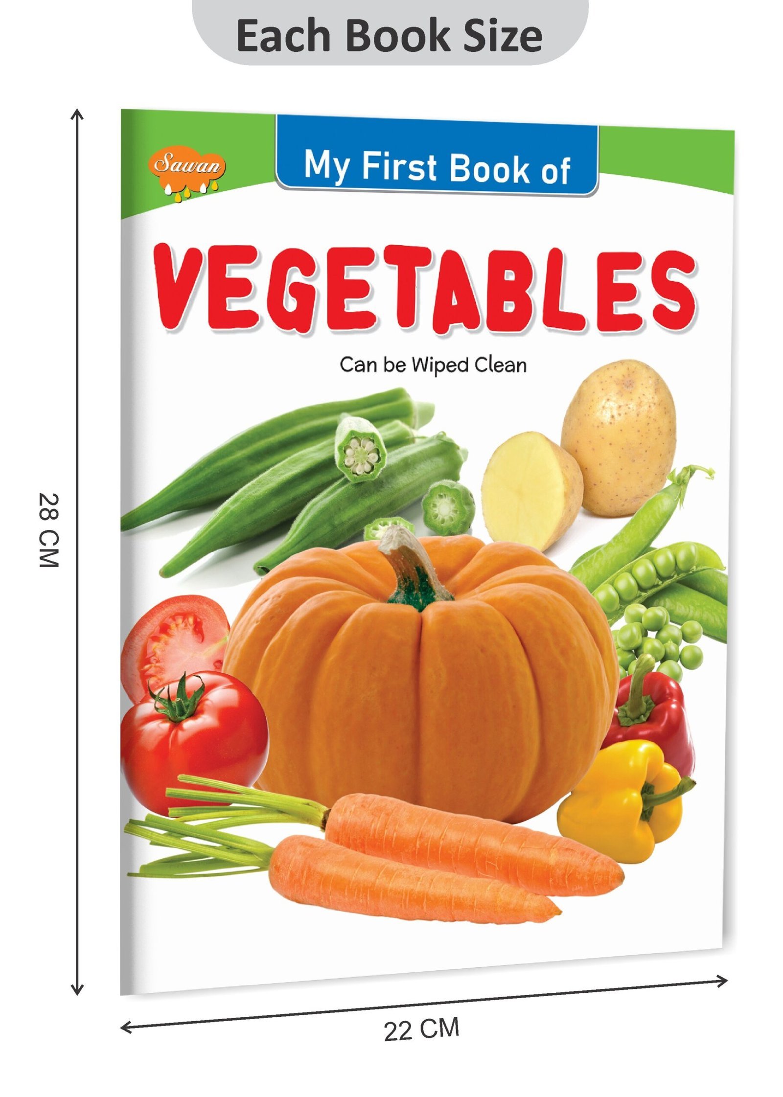 “Vegetables” is an educational and interactive early learning book for kids in the esteemed My First Book series by Sawan Books. With its wipe-clean pages, children can actively engage in learning about a variety of vegetables. This book features approximately 8 pages of durable board paper, ensuring longevity and easy handling for young readers. Each page showcases four-colour, laminated illustrations with realistic pictures, bringing the world of vegetables to life. Designed as an early learning tool, “Vegetables” introduces children to different vegetables, fostering their knowledge and appreciation for healthy eating enjoyably and educationally.