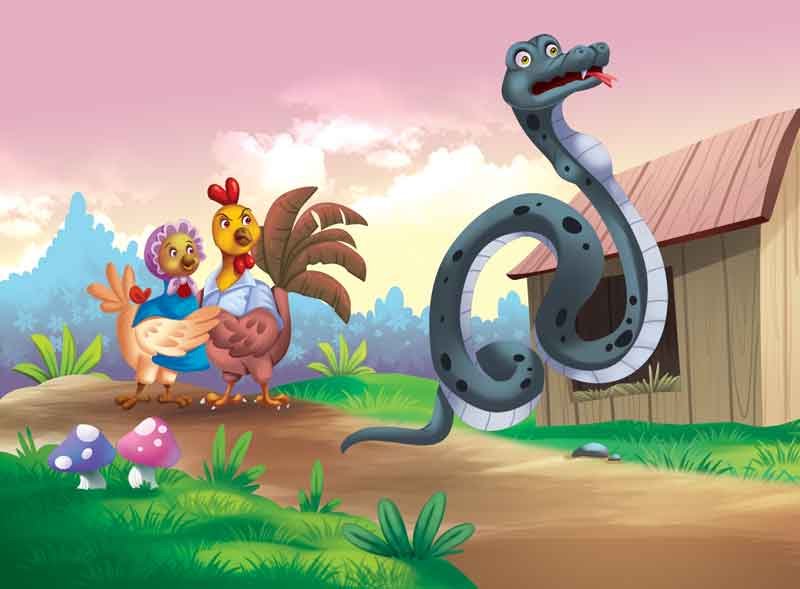 The hen trembled with fear as she had heard how the black snake swallowed eggs and crushed them in his throat mercilessly.