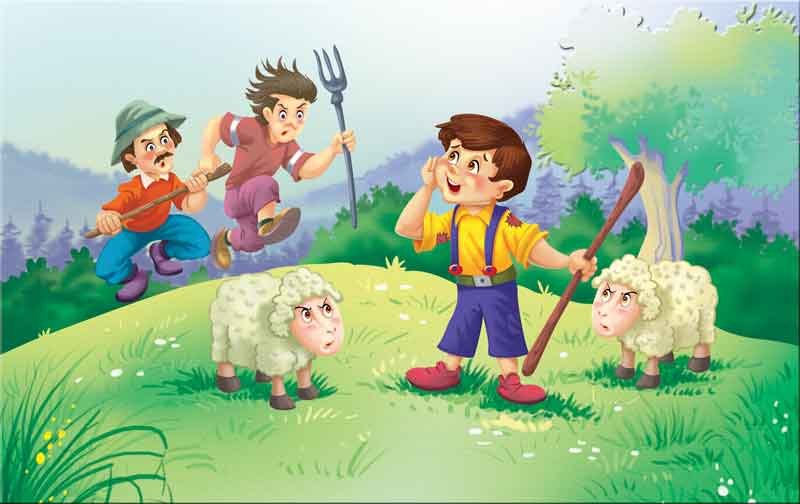 One day, the Boy had a naughty idea. He thought, ‘Let us see what happens if I yell loudly.’ The Boy yelled, “Wolf! Wolf! Help!” As the villagers heard the Boy’s cry, they rushed on top of the mountain with their sticks. But to their dismay, they found the Boy laughing at them. They scolded the boy and went back to the village.