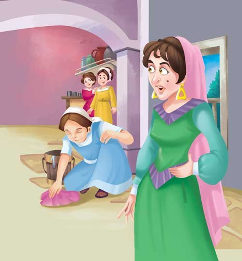 A woodsman had a kind wife and a pretty little daughter, but his wife died. He married a widow with two daughters of her own. She was neither good nor kind and her daughters were nasty little girls. They grew up into very plain-looking, lazy girls while the eldest daughter grew up to be very pretty and gentle. Her step-mother made her do all the work in the house: cooking, cleaning, washing and serving her stepmother and step-sisters. Her father was unable to do anything, for the woman scolded and beat the girl very often, and more so when he tried to protect her. She became even more cruel when she realised that her step-daughter was so pretty that her own girls looked ugly and no one would marry them if they saw the prettier girl! So, she made a very cruel plan to get rid of her step-daughter.