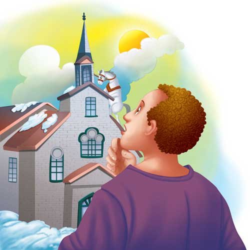 By the time night fell, the traveller was exhausted. There was snow all around. He dismounted near something that looked like a tree-stump and tied his horse to it. Unable to see anything in the dark, he curled up holding his pistols, near the horse, and fell asleep. He awoke with the sun shining brightly into his face. He sat up, startled. He found himself in a village square, with streets and houses and church near him! There was no sign of the snow or his horse. Suddenly, he heard a familiar neighing sound. He looked around and then up. His horse was hanging by the bridle, tied to the steeple of the church! He had mistaken the church steeple for a tree -stump. He pulled out his pistol and shot at the bridle, bringing down his poor horse! He smiled as he remembered the old man’s blessing and went ahead to Russia on his horse!