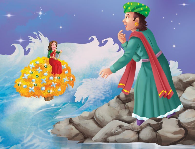 Satyamani saw a tree rising out of the sea. It was glowing. Its leaves were made of gold; the fruits and the flowers of the tree were made of diamonds, sapphires and pearls. And a more strange sight was that a young lady was sitting on the tree and playing upon the lyre. After a while, the sparkling tree went under the water.