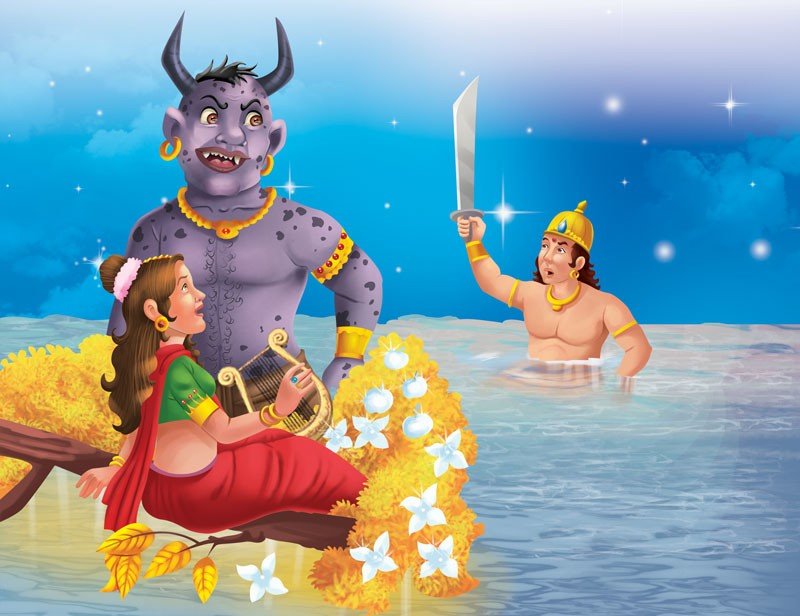 So, leaving Satyamani to manage the affairs of the court, the King went to the sea-shore. As soon as he saw the tree surfacing from the water, he swam up to it. The maiden was sitting on the tree, as usual, and playing upon the lyre. She said to the King, “Why have you come here?” But the king did not say anything. After a pause, the King said, “I am attracted by your beauty.” Soon, the King and the lady got married.