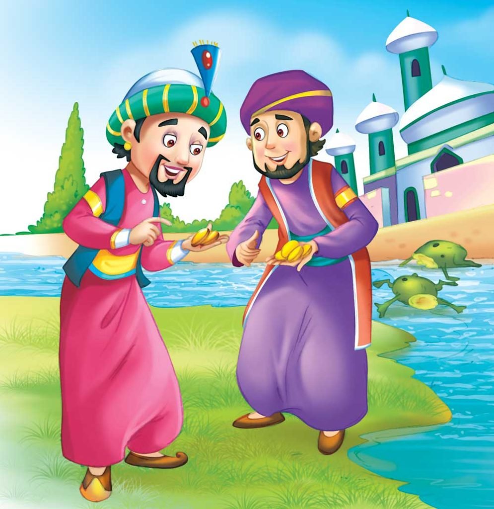 Two evil, monstrous frogs lived in a marsh and blocked the flow of water into the fields of the kingdom. They would only allow the water to flow if a human being was sacrificed to them every year. Now, the King’s son was to be sacrificed but his best friend offered himself to the frogs. Luckily, near the marsh, they heard the frogs talking. “What fools they are!” said the two frogs, “If they cut off our heads, the water will flow smoothly! And they will have gold and brass coins flowing out of their mouths whenever they wish!” The Prince understood their language and told his friend. Together, they slew the frogs. The water flowed into the fields and the two friends found they could pour out gold and brass coins as they wished! “If we return, they will think we are bewitched!” said the Prince. So, they went along to seek their fortune.